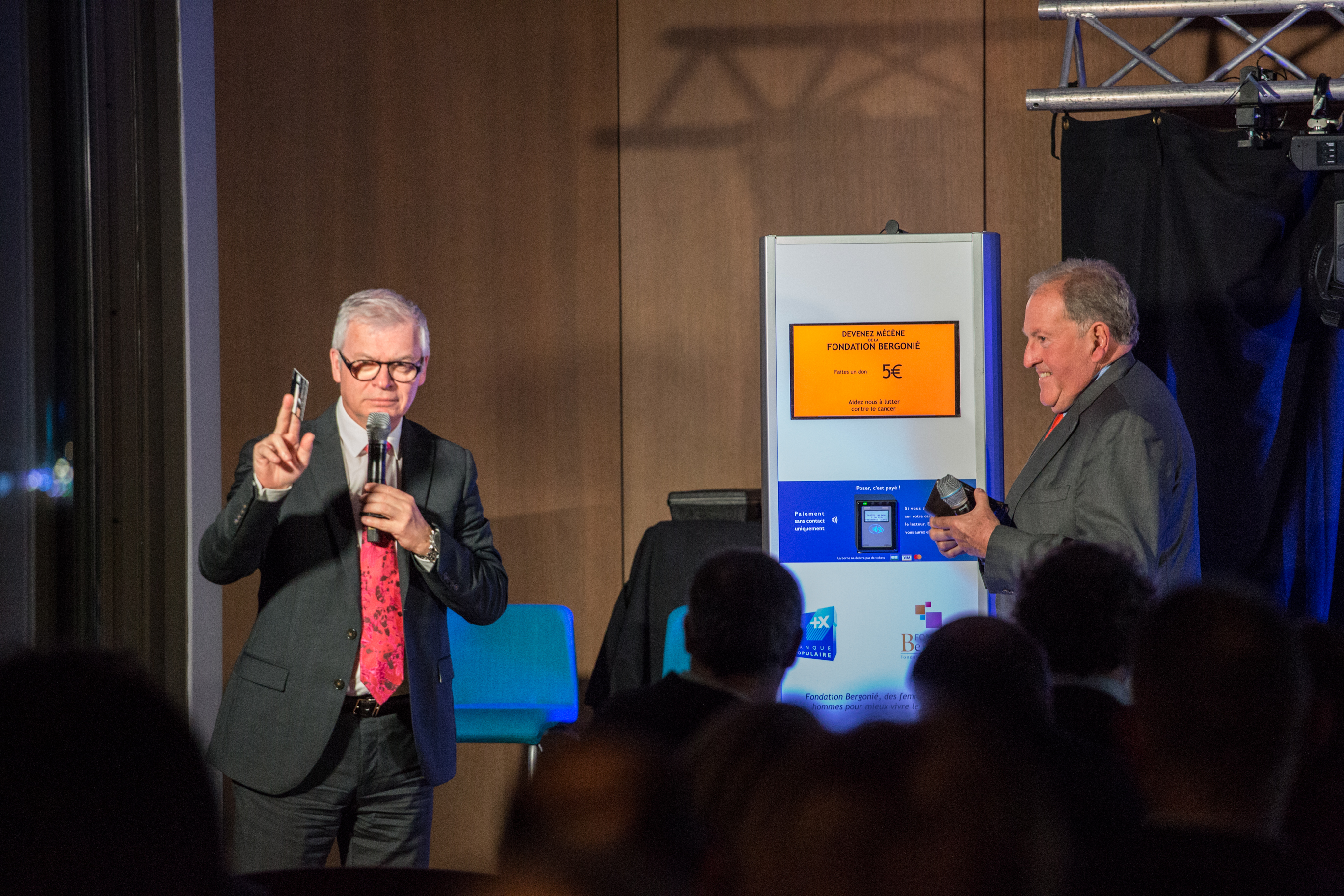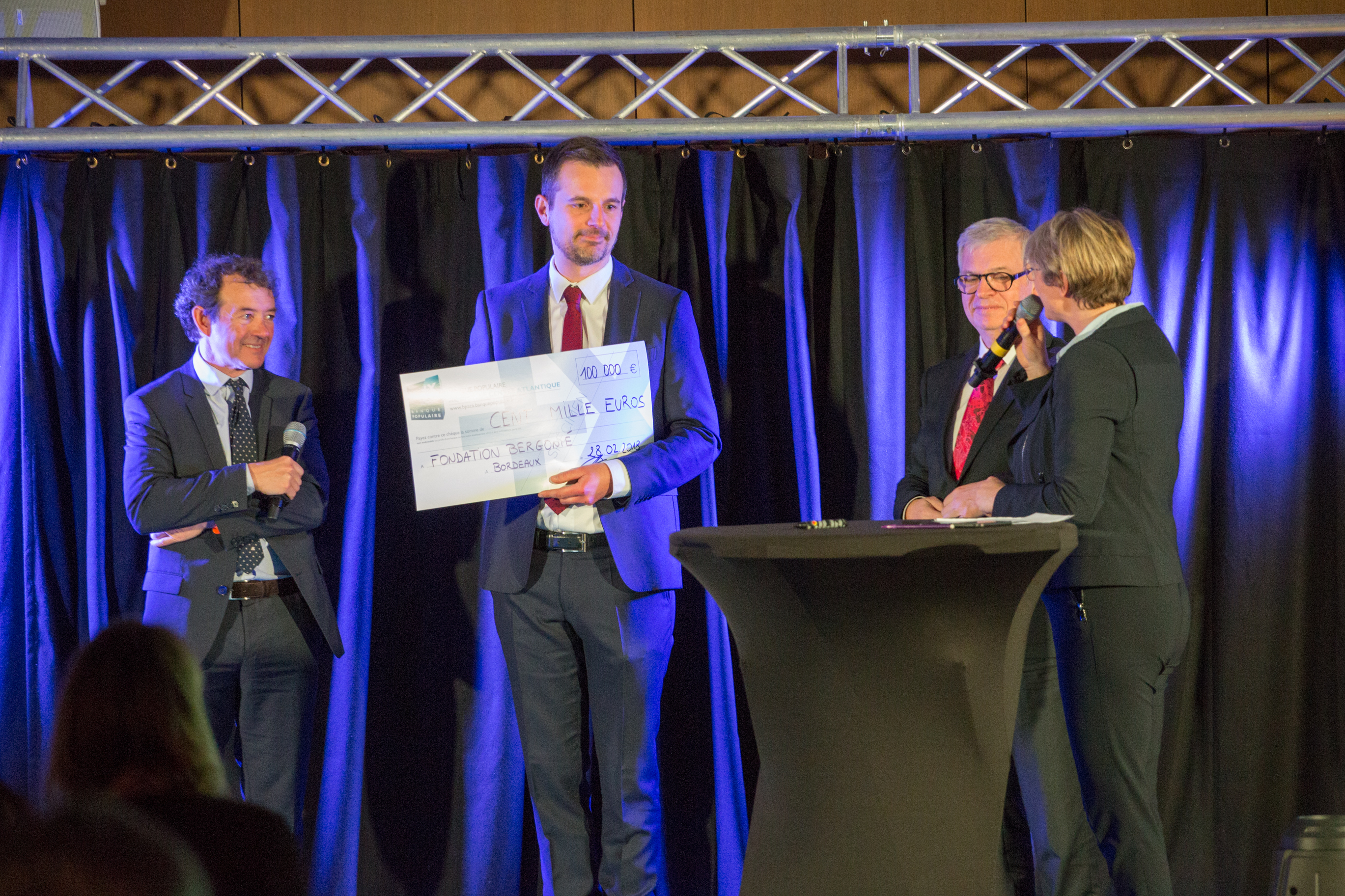 Principal donateur de de la Fondation Bergonié, la Banque Populaire Aquitaine Centre Atlantique a organisé en notre honneur une soirée caritative le mercredi 28 février 2018. A cette occasion, Dominique Garnier, Directeur Général de la Banque Populaire Aquitaine Centre Atlantique, et Bernard Dupouy, Président, ont remis respectivement à la Fondation une dotation de 100 000 € et une borne de dons sans contact Heoh.